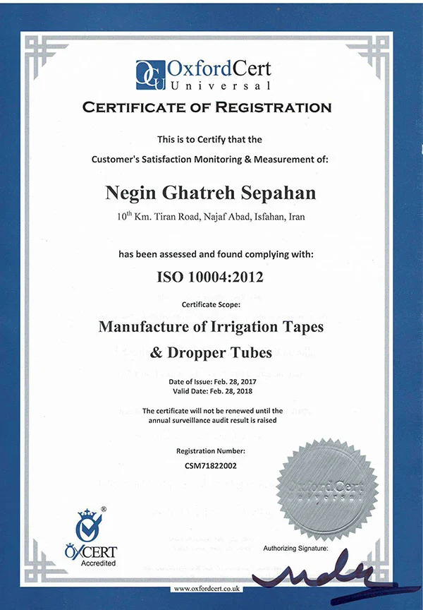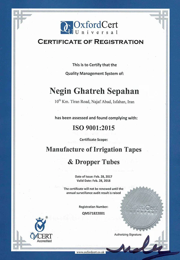 شرکت تولیدی نگین قطره سپاهان با توجه به اهمیت استفاده بهینه و صرفهجویی در مصرف آب با تکیه بر الطاف الهی و به کارگیری نیروهای متخصص و کارآمد و استفاده از ماشین آلات روز در تولید محصولات با کیفیت و جلب رضایت توانسته در زمره تولید کنندگان برتر نوار آبیاری قطرهای قرار گیرد.